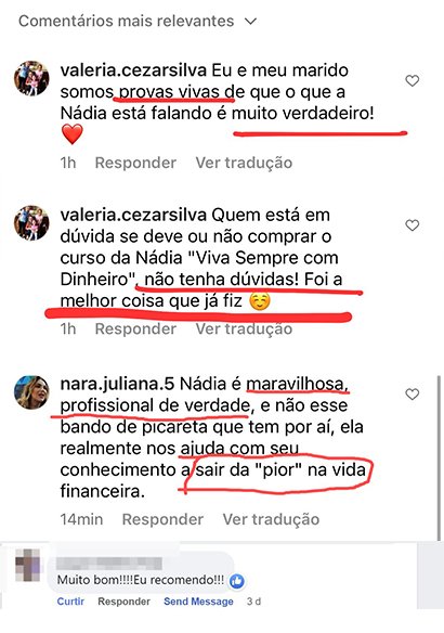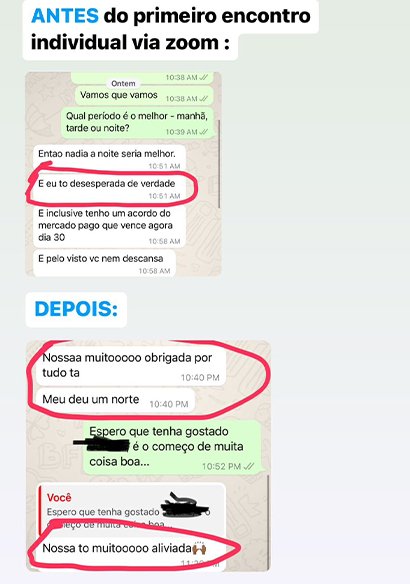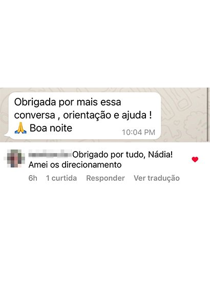 Além disto, você tem encontros on-line com a Nádia, bem como WhatsApp direto com a Nádia