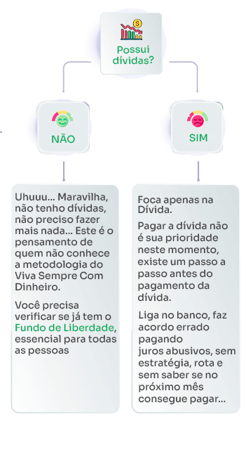 Aqui você vai entender o que de fato deve fazer no seu dia a dia. Você vai poder visualizar onde você se encontra financeiramente e tomar as decisões coerentes sobre de acordo com o seu contexto.