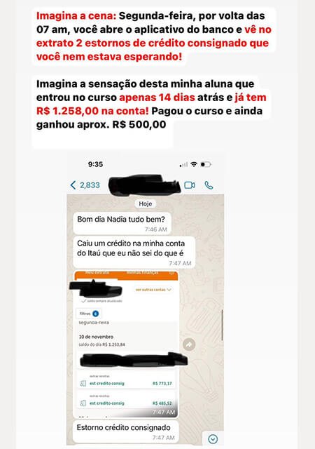 Ah, e mais uma coisa, sou correspondente bancária certificada. Podemos analisar possíveis reduções nas dívidas, e vários alunos já foram beneficiados com a redução do consignado.