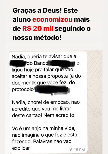 Luciana estava completamente endividada, sem perspectiva, desesperada e não sabia mais o que fazer, entrou no curso com muitas dívidas de empréstimos consignados, empréstimos pessoais e cartões de crédito. Ela recebeu estornos dos empréstimos no valor de R$ 21 mil, pagou as dívidas com descontos de 70% e hoje está fechando o mês com dinheiro na conta.. Hoje ela está muito tranquila e feliz Assista o vídeo emocionante e como ela conseguiu sair da UTI e hoje ela dorme em paz.